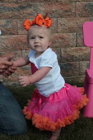 We tried to make her feel better today! She had her usual morning banana and some cuppy. Then we got her dressed in her birthday tutu and shirt! Then, of course, I had to do her hair!